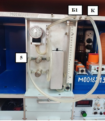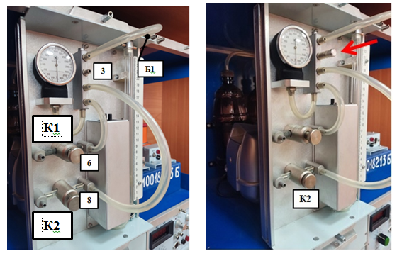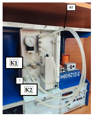 - С помощью трубки к крану К1 в точке 5 (рис. 6) подключить выход компрессора от баллона К.