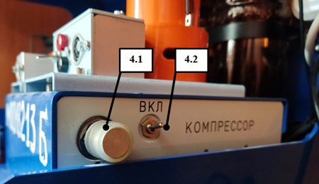 - Понизить до минимума питание компрессора поворотом цилиндрического регулятора 4.1 (рис. 7) против часовой стрелки до упора. Включить компрессор 4, подняв вверх тумблер «ВКЛ» 4.2. Плавным поворотом цилиндрического регулятора по часовой стрелке увеличить питание компрессора до необходимого уровня, чтобы накачать в баллон Б1 воздух до давления Р1, равного 120–200 мм рт. ст. Выключить компрессор по достижении необходимого давления, опустив вниз тумблер «ВКЛ» 4.2, и поворотом цилиндрического регулятора 4.1 против часовой стрелки снизить питание компрессора до минимума.