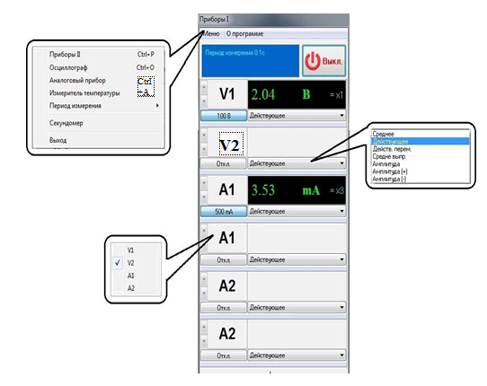 3 – амперметр 1, амперметр 2; 4 – виртуальные измерительные приборы амперметры А1, А2;