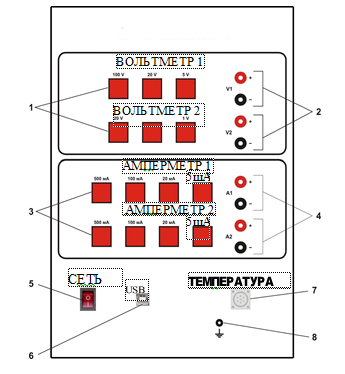 6 – USB connector for connecting to a computer; 7 – connector for connecting a thermocouple; 8 – grounding socket